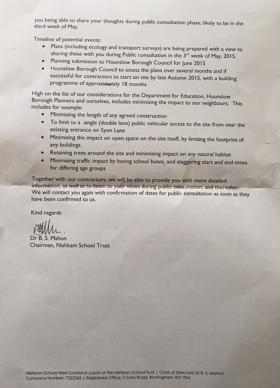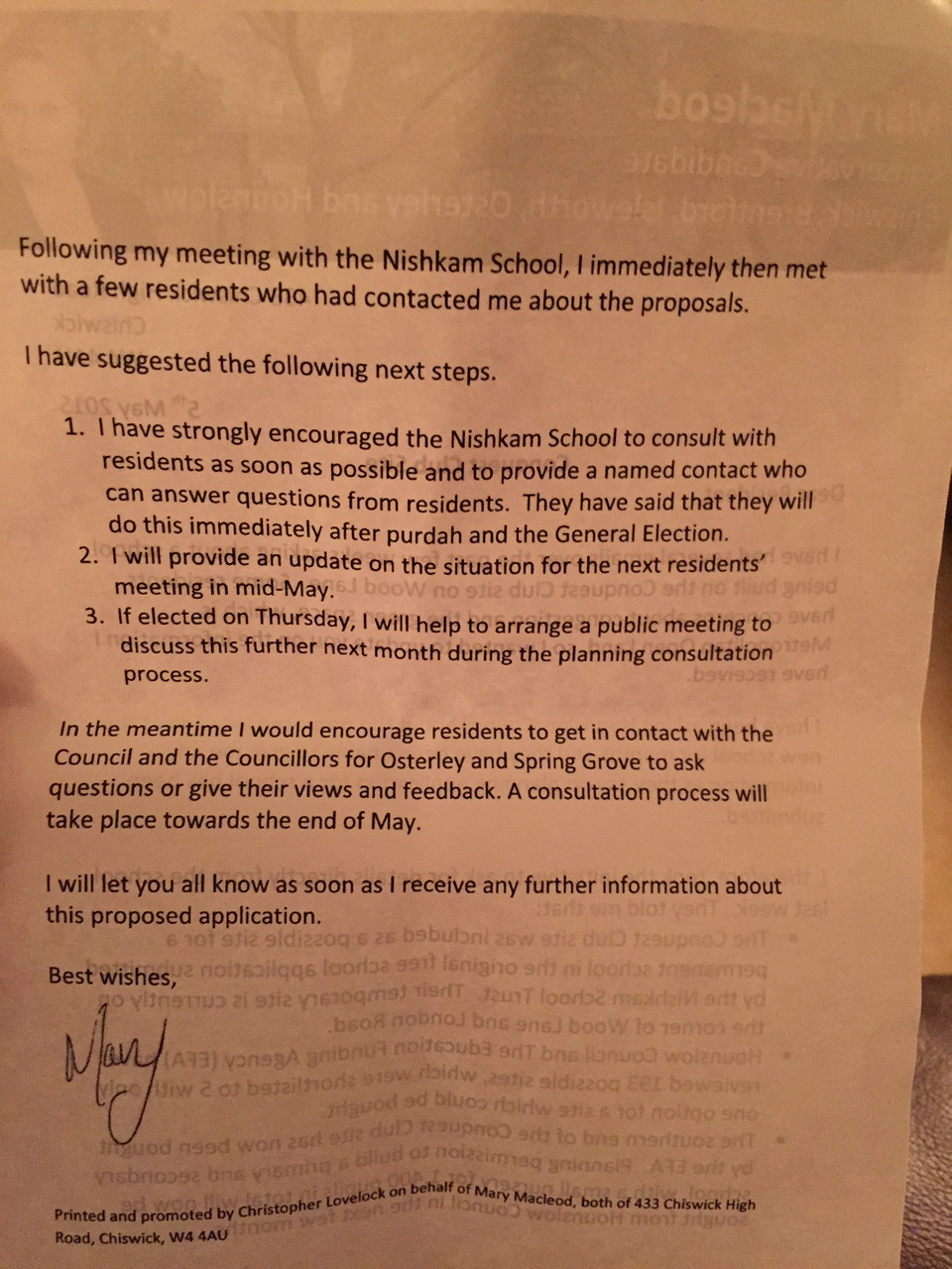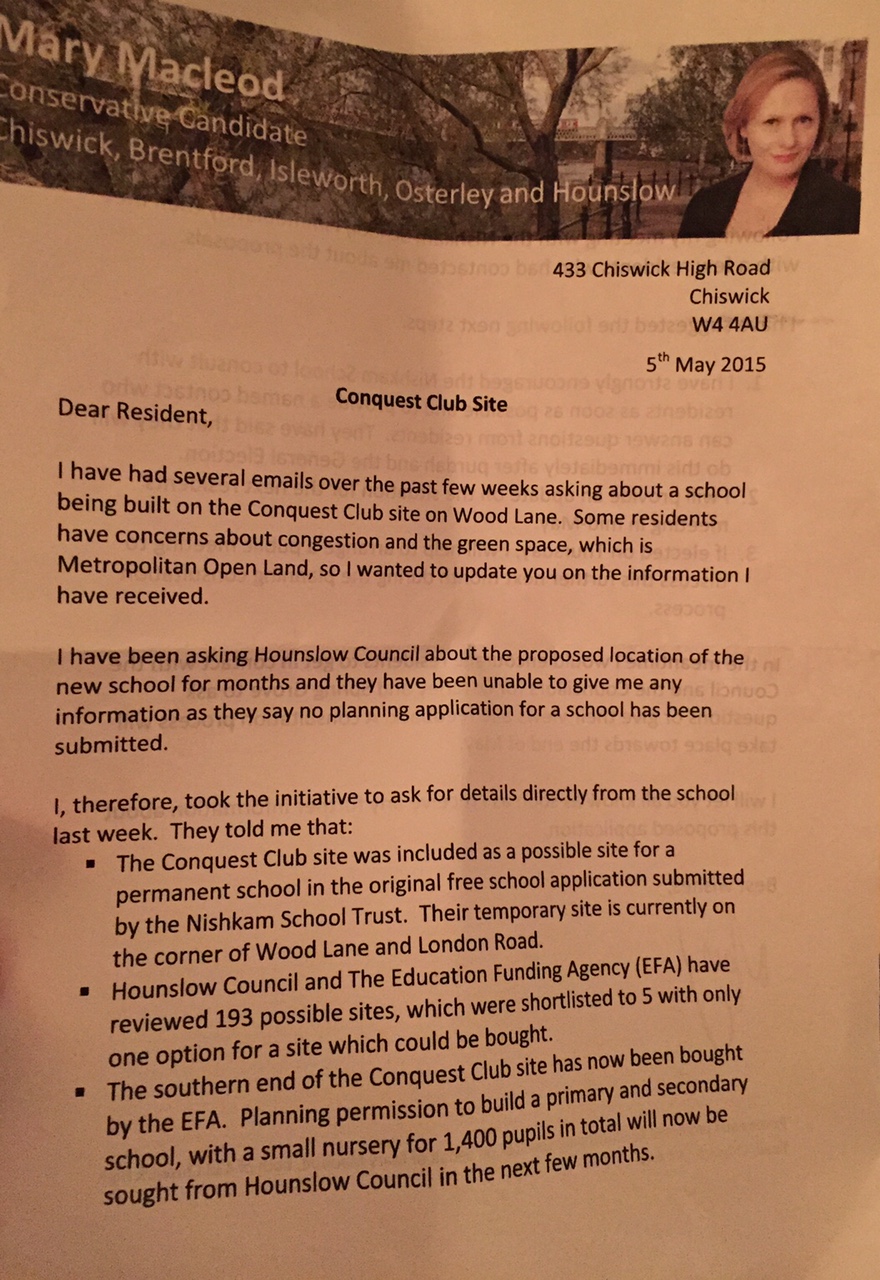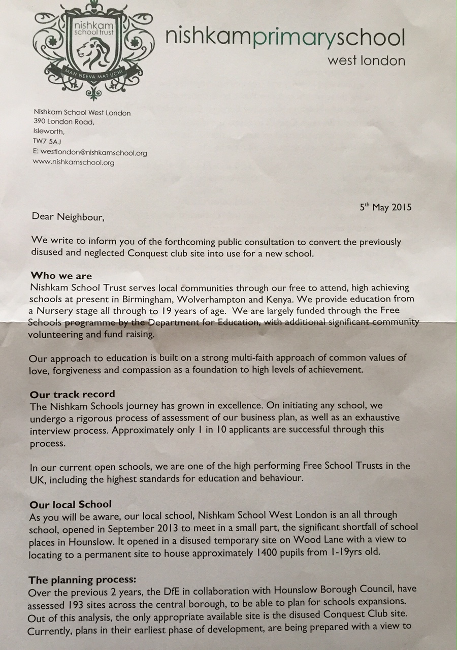 After a two year wait but in the space of just 12 hours, on 5 and 6 May 2015 some residents who would be affected by a development on the Conquest Club site received two letters. One was from Mary McCleod, Conservative parliamentary candidate, and the other was from Dr B S Mahon, Chairman, of the Nishkam Free School School Trust. Both letters sought in different ways to respond to increasingly vocal concerns about the mooted development (I cannot even say “proposed” since it has not yet been properly proposed).